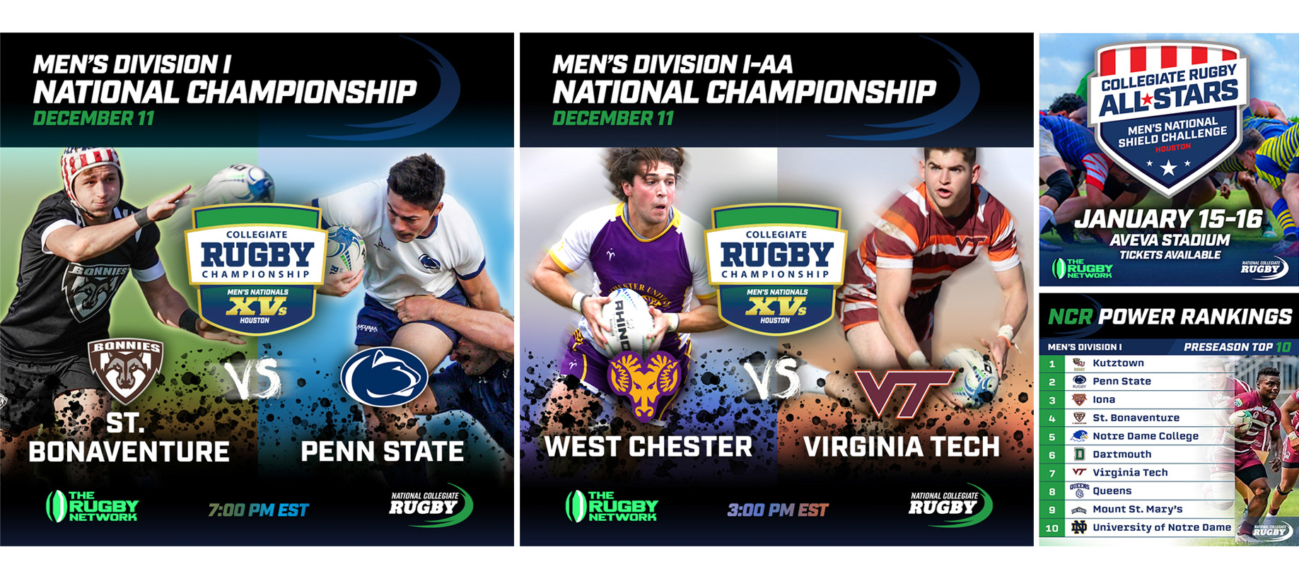 Logo designs and supporting branded social posts and posters for National Collegiate Rugby